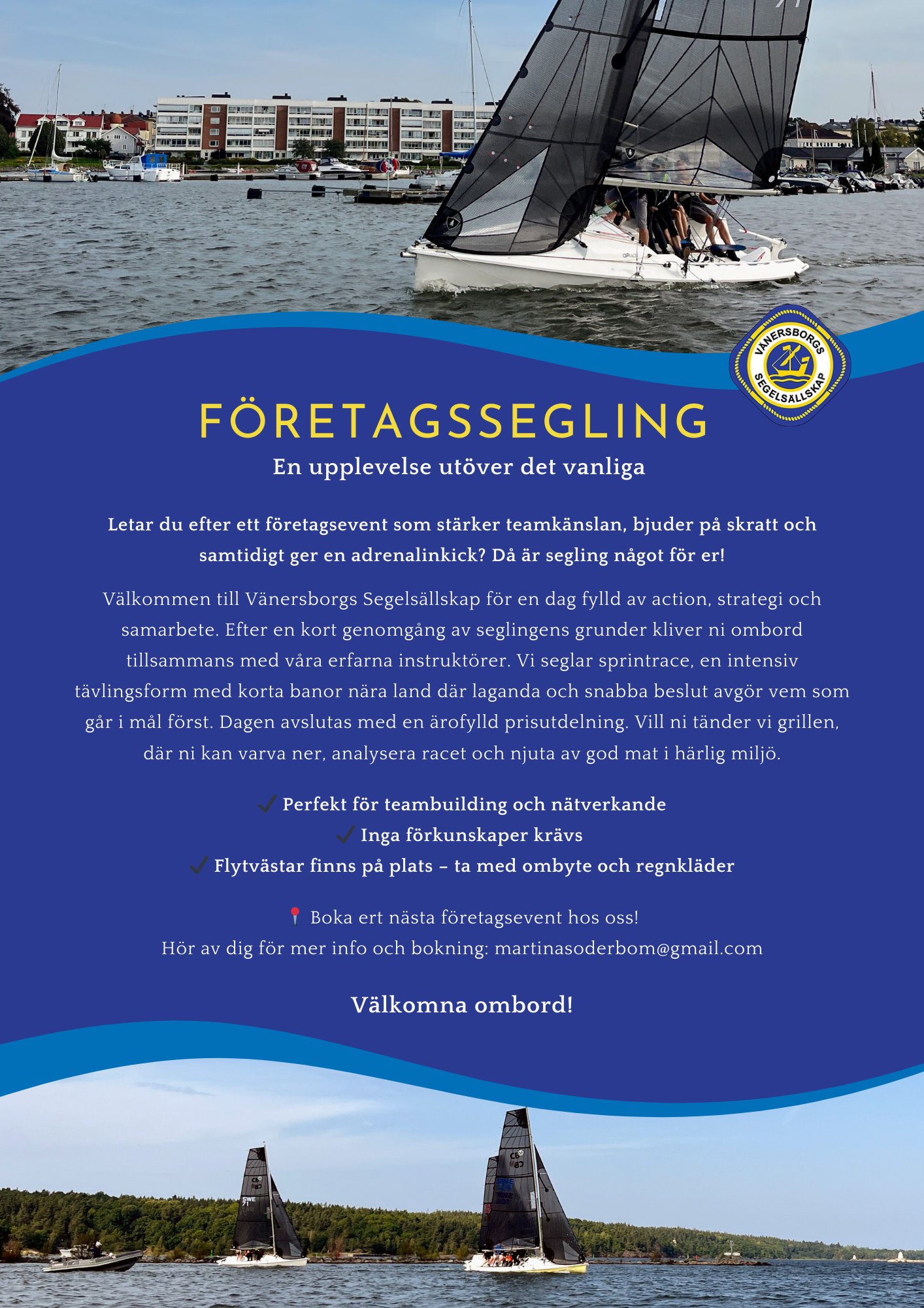 Vi kan arrangera eventsegling för företag under en eftermiddag/kväll med sprintsegling med våra snabba små kölbåtar CB 66. En snabb och rolig seglingsform med mycket action. Ingen förkunskap förutom simkunnighet krävs . Vi har egna instruktörer med i båtarna.
